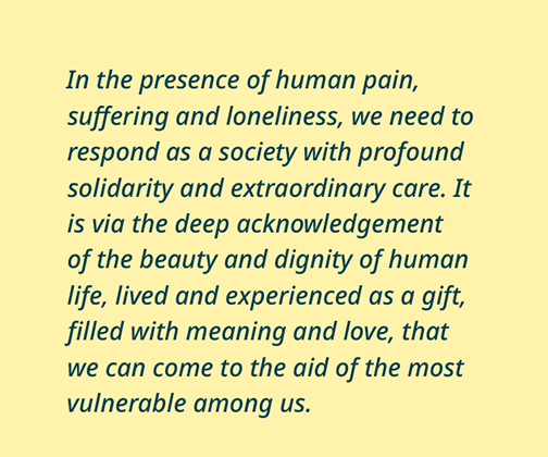 Instead, we must embrace those who suffer, and offer exceptional care to those who are confronting illness and death; to deploy our expertise and resources in confronting complex cases of care, rather than choosing lethal procedures that are incompatible with the dignity of both the patient and the health-care professional. Palliative care administered with unwavering compassion, generosity and skill expresses the best of who we are. Rather than withdrawing from those who are not far from leaving us, we must embrace them even more tightly, helping them to find meaning up to the last moments of life. This is how we build compassionate communities.